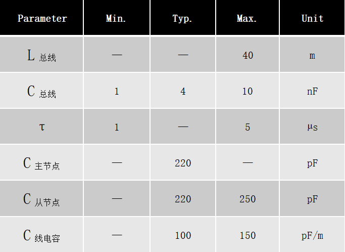 RC時(shí)間常數(shù)(τ)、主從節(jié)點(diǎn)電容(C主節(jié)點(diǎn)、C從節(jié)點(diǎn))、總線上的等效總電容(C總線)、線電容(C線電容)、總線長(zhǎng)度(L總線):